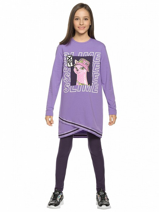 Комплект для девочек туника и лосины. Туника из футера О силуэта со спущенным плечом. Низ изделия фигурный, декорирован эластичной тесьмой. Стойкий принт с неоном. Надпись на панаме Клёвый образ. Утепленные лосины с начесом.
