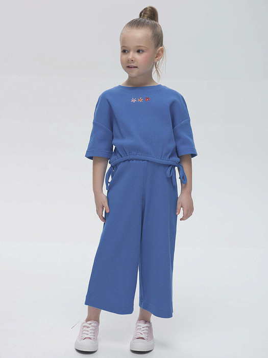 Комплект для девочки (кроп-топ и кюлоты), в котором собраны все самые актуальные тренды. Кроп-топ оверсайз-силуэта с сильно спущенным плечом дополнен утяжками по низу, с помощью которых можно регулировать объём и менять силуэт изделия. Брюки на широкой резинке с внутренней регулировкой объема шнуром. Благодаря особенностям кроя костюм долго будет "расти" вместе с ребенком. Комплект выполнен из трикотажного полотна с модной "вафельной" текстурой. В составе ткани преобладает хлопок, поэтому модель комфортная, приятная на ощупь, в ней не будет жарко летом. Эластан в составе ткани помогает изделию сохранять форму. Ткань проста в уходе. Изюминка топа — лаконичная вышивка в виде трёх цветков. Комплект идеально сядет на девочку любой фигуры, можно покупать без примерки. Костюм для настоящих модниц, в нем каждая девочка будет выглядеть стильно и эффектно.