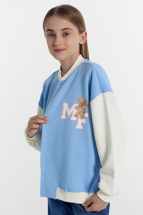 Жакет свободного кроя. Боковые швы к низу перенесены вперед. Круглый вырез горловины. В горловину втачан воротник-стойка из рибаны. Плечо спущено, пройма углубленна. Рукава втачные, длинные. По низу рукавов манжеты из рибаны. В боковых швах карманы . По низу изделия отрезной пояс из рибаны.