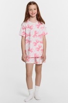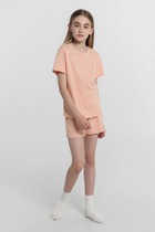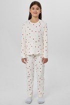 Комплект хлопковой пижамы из футболки и брюк. Футболка свободного кроя дополнена эластичной горловиной и стильным принтом. Брюки среднего объема, эластичный пояс обеспечит комфорт и идеальную посадку. По низу брюк эластичные манжеты.