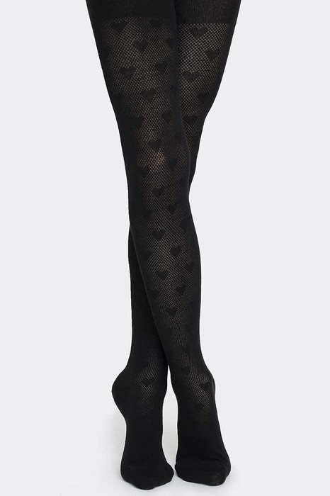 Гладкие колготки с рисунком в виде сердечек сетки по всей колготке.