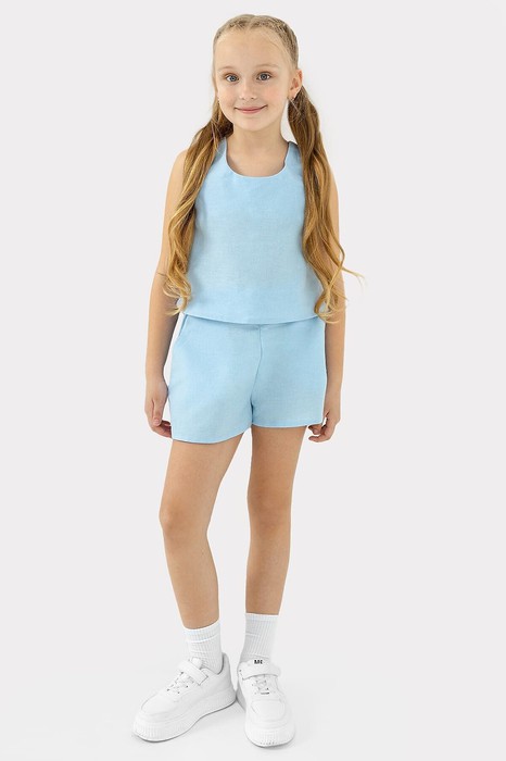 Комплект состоит из топа и шорт. Топ А-силуэта. Перед и спинка цельнокроеные. Круглый вырез горловины. Обтачка горловины и пройм из основного полотна. Низ топа обработан швом в подгибку сзакрытым срезом. Шорты расклешенные. Пояс отрезной. Внутрь пояса застрочена эластичная тесьма по спинке. На передних половинках обработаны карманы с наклонным входом от боковых швов. Низ изделия обработан швом в подгибку с закрытым срезом.