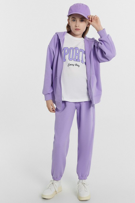 Комплект для девочек состоит из футболки, жакета и брюк. Футболка прямого силуэта. Перед и спинка цельнокроенные. Рукава втачные короткие. Линия плеча спущена. Горловина круглой формы, обтачка из трикотажного полотна рибаны 1*1. Шов втачивания рибаны по спинке закрыт бейкой из основного полотна. Низ футболки и рукавов обработан на 2-х игольной плоскошовной машине швом в подгибку. Жакет свободного силуэта с капюшоном. Капюшон на подкладке из основного полотна. Шов втачивания капюшона закрыт х/б тесьмой. Рукава втачные, линия плеча спущена. Притачные манжеты по низу рукавов и притачной пояс из рибаны. По переду застежка молния, карман кенгуру. Брюки свободного силуэта. Посадка средняя. Цельнокроеный пояс с эластичной тесьмой внутри. По поясу выполнены три декоративные строчки. По низу брюк застрочена внутрь эластичная тесьма.