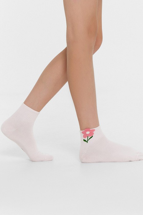 рис.2772 Гладкий детский носок с резинкой средней высоты и объёмным рисунком в виде цветка.