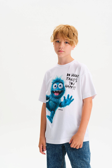 Футболка для мальчика прямого кроя - это идеальный выбор для активного ребенка. Вырез горловины обработан эластичной тканью — она прекрасно держит форму, не растягивается, при этом ребёнку удобно надевать и снимать футболку. Футболка с принтом и надписями. Перевод надписи: делай то, что делает тебя счастливым. Спортивная футболка подходит как для подростков так и для малышей в детский сад. Подходит для любого времени года.