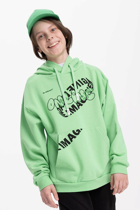 Худи для мальчика без начеса – актуальная вещь в любом сезоне, будь то весна, лето или осень. Кофта спортивная для мальчика выполнена из плотного футера-петля, который отлично согревает в прохладную погоду и при этом хорошо пропускает воздух – ребенок активно двигается, играет, не потеет. Толстовка свободного покроя оверсайз со спущенным плечом, углубленной проймой. Рукава а также низ изделия на манжете из рибаны. Удобный карман кенгуру. Капюшон на запахе со шнурками для регулировки. Изделие выполнено в актуальном стиле Digital и понравится юным геймерам, а также любителям одежды в корейском стиле и в стиле аниме. По переду текстовый принт. Перевод принта "be different" - будь разным, "imagine online" - представь себе онлайн. Размерный ряд подходит как для малышей так и для подростков.
