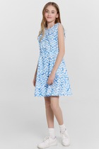 Платье для девочек свободного силуэта на бретелях. По спинке верхнего края платья внутри эластичная тесьма RV20. Платье отрезное по талии, с кулиской. В ней пробиты петли и протянута эластичная тесьма SFKR-1, с фиксаторами SFFKR-1, образуют сборку. По боковым швам накладные карманы с клапаном. Низ платья обработан швом вподгибку.