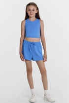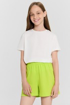 Шорты-велосипедки из трикотажного полотна кулирного переплетения. Длина шортов – до колена, силуэт – облегающий. Пояс с эластичной тесьмой. Нижние срезы подогнуты. Стильный и очень комфортный вариант!