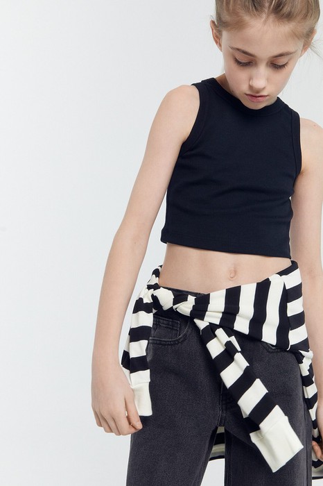 Топ для девочек прилегающего силуэта. Горловина круглая. Проймы и горловина окантованы бейкой из основного полотна. Низ изделия обработан швом в подгибку.