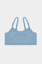 Топ для девочек из рибаны, облегающего силуэта, длиной ниже уровня талии. Перед и спинка цельнокроеные. Горловина круглая. Горловина и проймы окантованы широкой бейкой из основного полотна. Низ изделия обработан швом вподгибку.