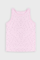 Топ для девочек прилегающего силуэта. Горловина круглая. Проймы и горловина окантованы бейкой из основного полотна. Низ изделия обработан швом в подгибку.