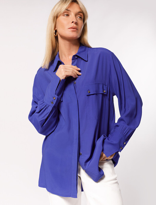 Блузка с имитацией карманов и удлиненными манжетами выполнена из премиальной вискозы и лиоцелла. На спинке изделия фирменный логотип бренда. Имитация карманов позволяет этому элементу выглядеть аккуратно без складок и фалд, которые вероятны на такой пластичной ткани.Застежка на золотистые пуговицы. Приятная на ощупь ткань охлаждает кожу в жаркую погоду. Отлично впишется в нестрогий офисный дресс-код или в  расслабленном повседневном образе с джинсами.