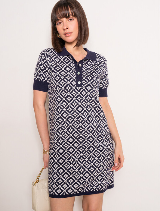 Платье длины мини с воротником поло выполнено из мягкого трикотажа на основе шелковистой эластичной вискозы. Жаккардовое переплетение образует геометрический узор. Застежка на перламутровые пуговицы подчеркивает гладкость пряжи. Контрастный воротник и манжеты делают узор еще более выразительным. Можно сочетать с жакетом D31.388 из жаккардовой коллекции.