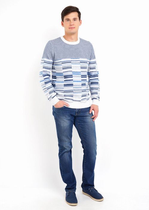 Мужской джемпер из смесовой пряжи с круглым вырезом горловины и длинным рукавом. По низу рукава и изделия комфортная эластичная резинка. Модель интересна за счет кокетки и комбинации плашечной цветной вязки, а так же дополнена металлофурнитурой.
