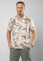 Джемпер с коротким рукавом среднего объема. Воротник отложной вязаный, планка на петли и пуговицы, накладной карман. Низ рукава на вязаной манжете.