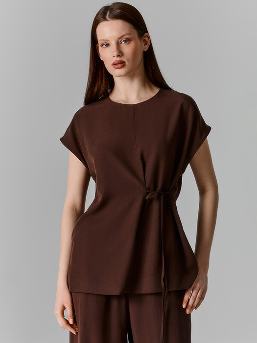 Блуза свободного силуэта, прямая. Горловина обработана обтачкой, рукава цельнокроеные. Спереди средний шов и завязка. Второй конец завязки в боку. Сзади капелька с петлей из жилки тканой (жилка JW34493, WT4-4)  и пуговицей 10мм.  Низ и рукава вподгибку.