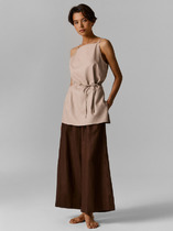 Бриджи женские, свободного силуэта с высокой посадкой. Пояс цельнокроеный с эластичной тесьмой внутри (внутр. 60мм 69RV). С внешней стороны пояса пробиты петли  и вставлен шнур-бейка из основного полотна. В боковых швах обработаны карманы. Нижние срезы брюк обработаны швом вподгибку с закрытым срезом.