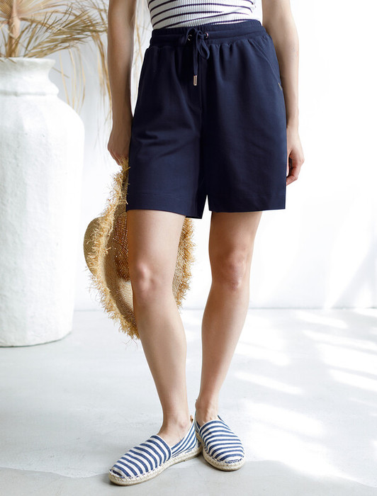 Шорты выполнены из футера двухнитки с эластаном. Модель прямого кроя дополнена боковыми карманами и одним задним карманом.  Пояс выполнен из эластичного трикотажа в рубчик. В пояс вставлен плоский хлопковый шнур в тон изделия с серебристыми наконечниками. Изделие дополнено металлическим логотипом бренда. Сочетается в костюме с жакетом D49.078, джемпером D49.079, D49.080 и футболкой D49.081