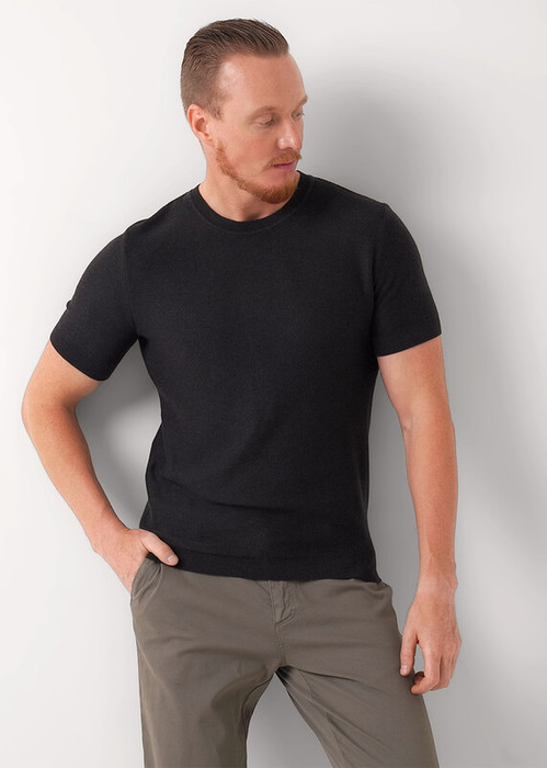 Вязаная футболка с коротким рукавом, выполненная из смесовой пряжи, обладает фактурным переплетением, которое придает ей стильный и современный вид. Эта модель прекрасно сочетается с джинсами, брюками позволяя создавать разнообразные образы.