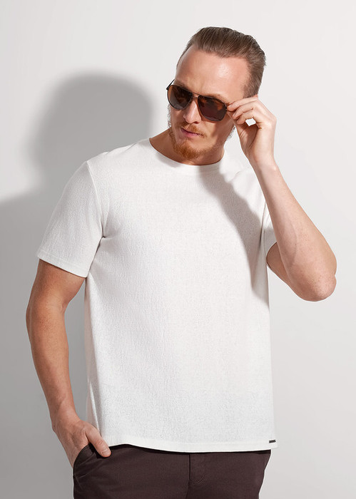 Футболка мужская из трикотажного полотна жаккард. Модель с круглым вырезом горловины, коротким втачным рукавом. Прекрасно сочетается с джинсами или шортами. Модель дополнена нашивкой и имиджевой фурнитурой.