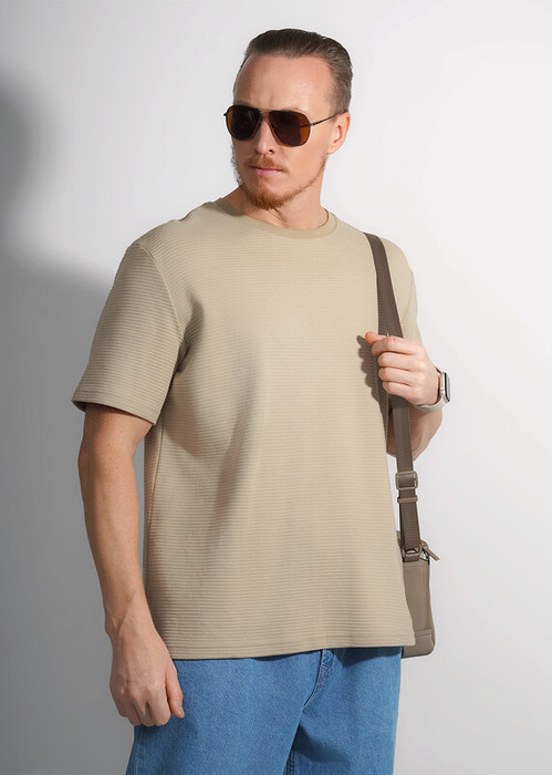 Футболка мужская, увеличенного обьема, из трикотажного фактурного полотна с эффектом валиков. Круглый вырез горловины и короткий втачной рукав. Отличный вариант для повседневного образа.