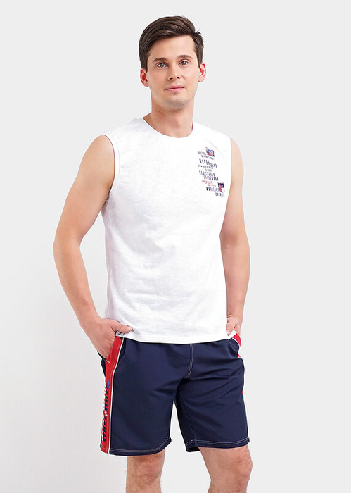 Стильные пляжные шорты комфортной посадки из быстросохнущего полотна. Модель дополнена небольшим принтом и контрастными строчками.
