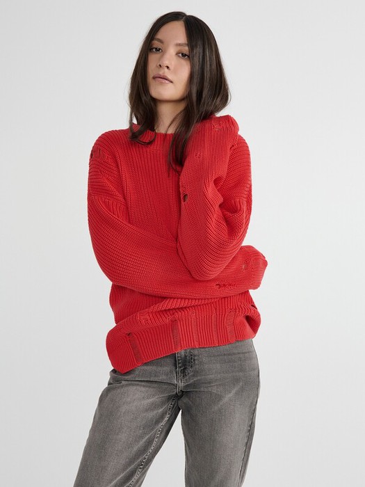 "Джемпер объёмного силуэта из хлопка с имитацией разрывов станет акцентной основой для повседневных ярких образов. Модель можно стилизовать с разными вещами, например, с расслабленным денимом, брюками или юбками.