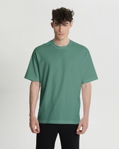 Фуфайка с коротким рукавом среднего объема, круглым вырезом горловины, которая оформлена обтачкой из рибаны.