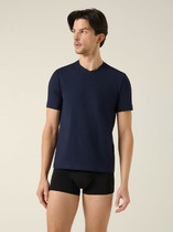 Фуфайка с коротким рукавом среднего объема, круглым вырезом горловины, которая оформлена обтачкой из рибаны.
