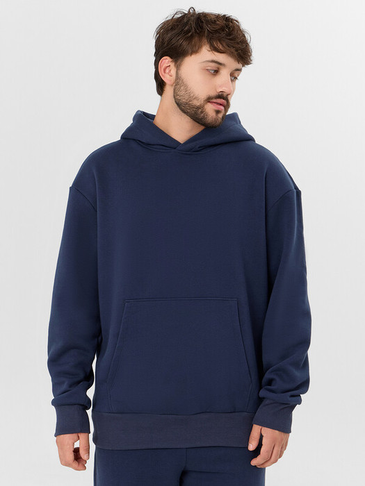 Мужское худи свободного силуэта из трикотажного футера с теплым подчесом. Круглая горловина с капюшоном, длинные рукава на манжетах, слегка спущенная линия плеча, пояс из рибаны – худи удачно сочетает комфортный дизайн и отличное качество!