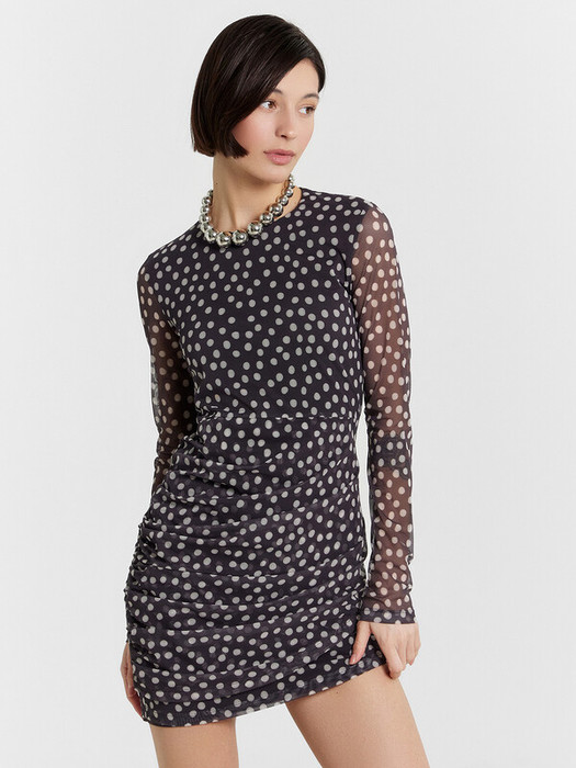 Это очаровательное женское платье — идеальный выбор для создания элегантного и женственного образа! Прилегающий силуэт и длина мини подчеркивают фигуру, делая модель стильной и изысканной. Горловина круглой формы, придающая платью классический и аккуратный вид. Длинные рукава из полупрозрачной сетки с принтом добавляют утонченности и легкости. Подкладка из кулирки обеспечивает комфорт и мягкость, что делает платье удобным в носке. Особой изюминкой модели является накладная деталь на нижней части, оформленная сборками по бокам. Это решение добавляет уникальности и динамики дизайну. Нижний срез платья и рукавов обработан швом вподгибку, что гарантирует аккуратный внешний вид и долговечность. Идеальное платье для особых случаев или вечерних прогулок, оно подарит вам ощущение уверенности и элегантности!