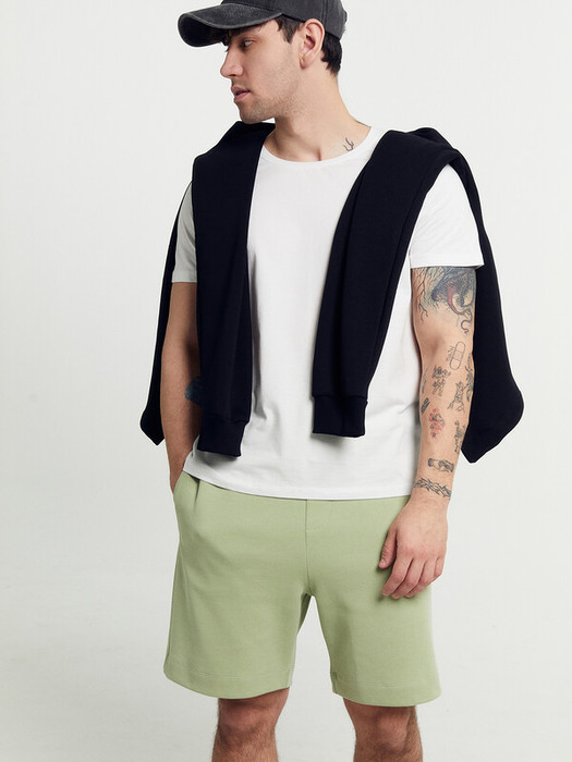 Шорты изготовлены из трикотажного полотна интерлок. Шорты свободного силуэта. Длиной выше колена. Пояс  отрезной с эластичной тесьмой внутри. С внутренней стороны пояса пробиты петли и вставлен шнур с застр. концами. На левой детали переда проложена строчка - имитация гульфика. В боковых швах обработаны карманы. Нижние срезы шорт обработаны швом вподгибку.