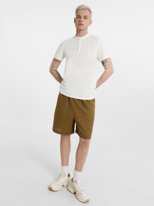 Шорты прямые свободные, посадка средняя. Пояс отрезной с эластичной тесьмой внутри (внутренняя резина. По переду пробиты петли и втянут шнур-бейка из основного полотна с застроченными концами. В боковых швах обработаны карманы. По переду обработан гульфик с супатной застежкой на петли и пуговицы. На задней правой половинке накладной карман. Нижние срезы шорт обработаны швом вподгибку с закрытым срезом.