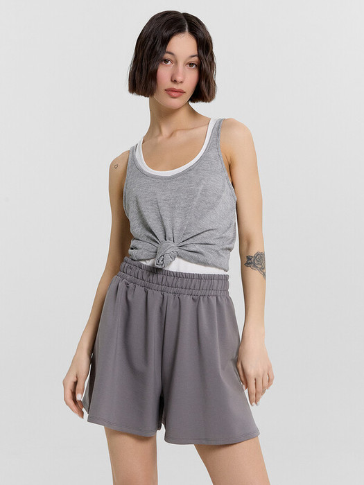 Шорты широкие, короткие. Посадка высокая. Пояс отрезной с эластичной тесьмой внутри (внутр. 60мм 60RV). Шорты без боковых швов. Нижние срезы обработаны швом вподгибку