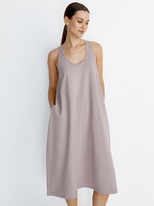 Женское платье «макси» А – силуэта с открытой проймой, глубоким круглым вырезом и карманами в боковых швах.