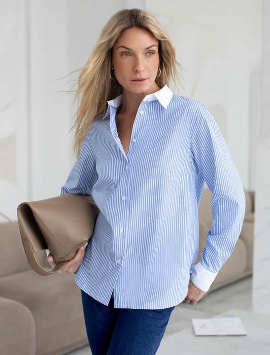 Блузка прямого силуэта с контрастными манжетами и отложным воротником. Модель выполнена из хлопка с добавлением ПЭ, благодаря этому материал почти не мнется, долго сохраняет идеальный внешний вид. На спинке изделия металлический логотип бренда.