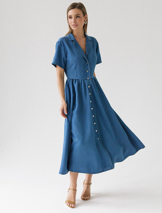 Платье выполнено из лиоцелла. Модель с английским воротником и пышной юбкой полусолнце дополнена пуговицами из натурального перламутра и боковыми карманами. Ткань с характерным атласным блеском полностью имитирует обычный деним, но в тоже время намного более мягкая, плавно струится по телу, хорошо драпируется и охлаждает кожу в жаркое время года.