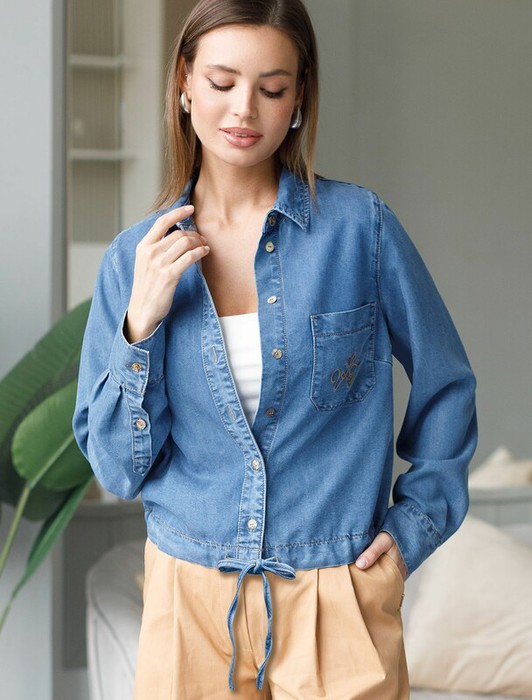 Укороченная стильная блузка светло-синего цвета с кулиской по низу выполнена из мягкого джинсового лиоцелла плотностью 7,8 OZ, который отлично держит форму и обеспечивает комфортную посадку на любую фигуру. Кулиска сформирует красивый силуэт, позволяя легко регулировать длину по желанию и подчеркнет достоинства фигуры, не стесняя движений. Короткая джинсовая рубашка на пуговицах с отложным воротником придаст образу стильный и современный вид. Практичная деталь — карман на груди с аккуратной вышивкой в виде логотипа бренда - украшает изделие. Ткань сочетает прочность и мягкость лиоцелла с вискозой, что делает её невероятно комфортной, дышащей, устойчивой к сминанию и идеально подходящей для чувствительной кожи. Благодаря нежным тактильным ощущениям, будто шелк, от которого ощущается приятная прохлада, рубашка отлично подходит для создания легких летних образов или стильных ансамблей на каждый день засчет своей универсальности. Длинный рукав гарантирует свободу движений и удобство на весь день. Джинсовую блузк