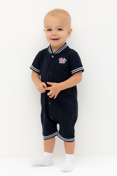 Легкий трикотажный песочник для мальчика из высококачественного хлопка. Застёгивается спереди на кнопки. Украшен вышивкой на груди. Изделие сохраняет цвет и форму после многократных стирок.
