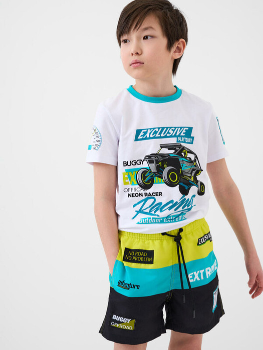 Плавательные шорты из быстросохнущего материала с водоотталкивающей пропиткой для мальчика подростка. Бордшорты (swimshort) средней длины. Модель с подкладкой из мягкой сетки в виде трусов, карманы из сетки. Сзади — карман с клапаном. Пояс на резинке с дополнительной регулировкой по талии шнурком. Благодаря UF-защите, ткань сохраняет первоначальный вид даже при длительном пребывании на солнце. Отличный вариант для пляжа и бассейна.
