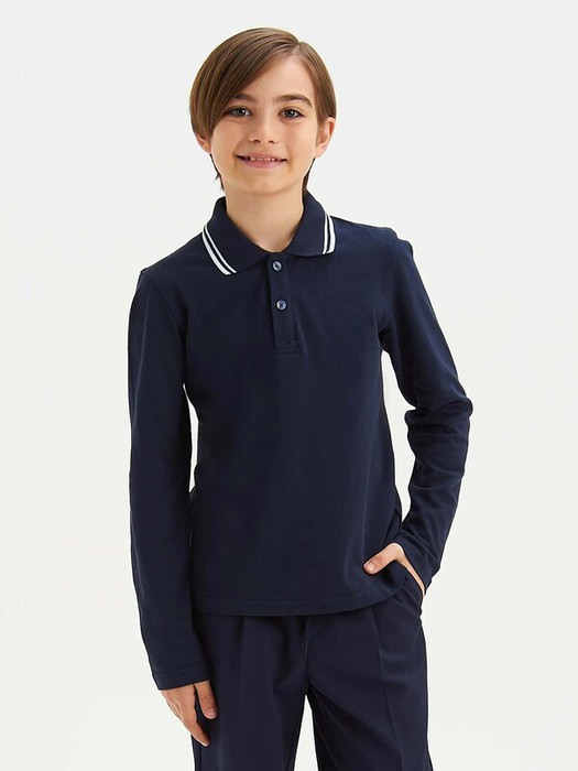 Поло из 100% хлопка с длинными рукавами, отложным воротником рубашечного типа, с центральной укороченной застежкой по переду на пуговицы. По краю воротника расположена контрастного цвета полоса.
