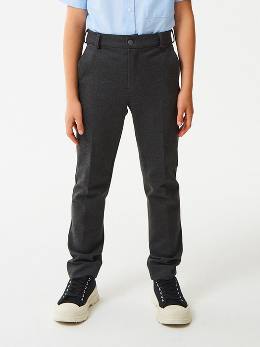 Брюки зауженные из трикотажа джерси для мальчика. Пояс с еврорезинкой сзади. На передней части брюк боковые карманы, горизонтальные защипы и застёжка - гульфик на молнии. На правой задней половинке брюк - карман с узкой листочкой. Отличный вариант на каждый день.
