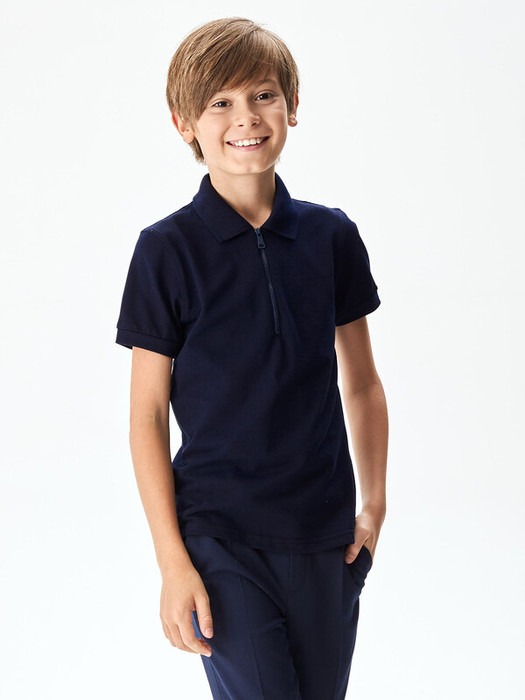 Поло из 100% хлопка с короткими рукавами, отложным воротником рубашечного типа, с центральной укороченной застежкой по переду на молнии.