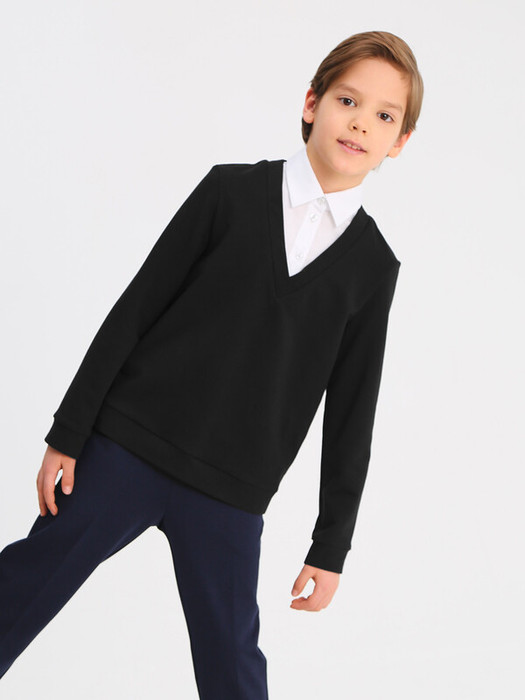 Джемпер трикотажный для мальчика прилегающего силуэта с имитацией манишки из сорочечной ткани контрастного цвета. Воротник отложной со стойкой. Укороченная застёжка на переде на планку с пуговицами. Рукава втачные длинные, на манжете. По низу изделия притачной пояс. Отличный вариант на каждый день.