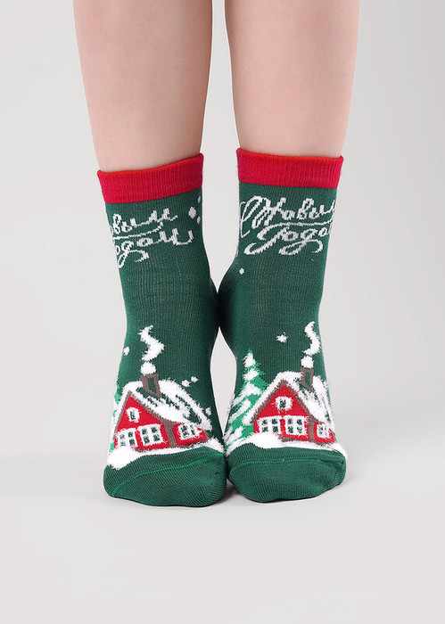 Носки детские с рисунком дом в зимнем лесу, снег выполнен из пряжи травка, и надписью С Новым годом!