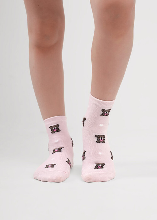 Носки для девочки с ажурной резинкой и рисунками мишки и сердечки.
