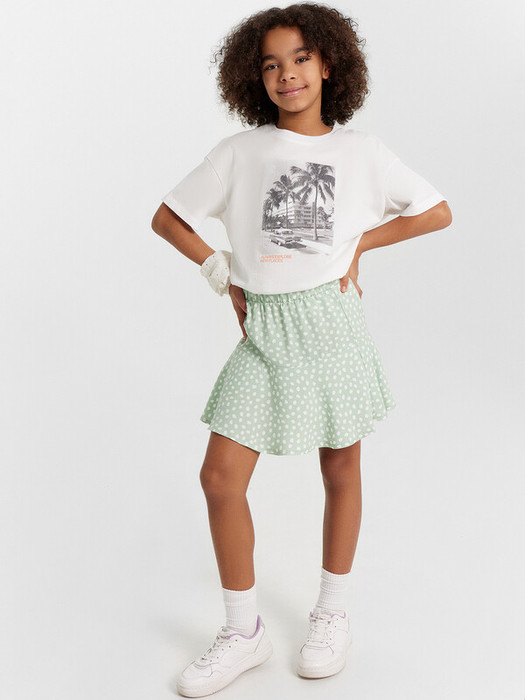 Футболка из трикотажного полотна кулирного переплетения. Силуэт свободный, длина до середины бедра. Рукава короткие, горловина круглая. Дизайн футболки наверняка понравится вашей моднице!