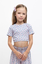 Необычная футболка для девочек, созданная из трикотажной кулирки. Силуэт прямой, длина до середины ягодиц. Горловина круглой формы. Спущенная линия плеча и углубленная пройма дарят особый комфорт, а короткие рукава в виде рюши делают футболку привлекательной.