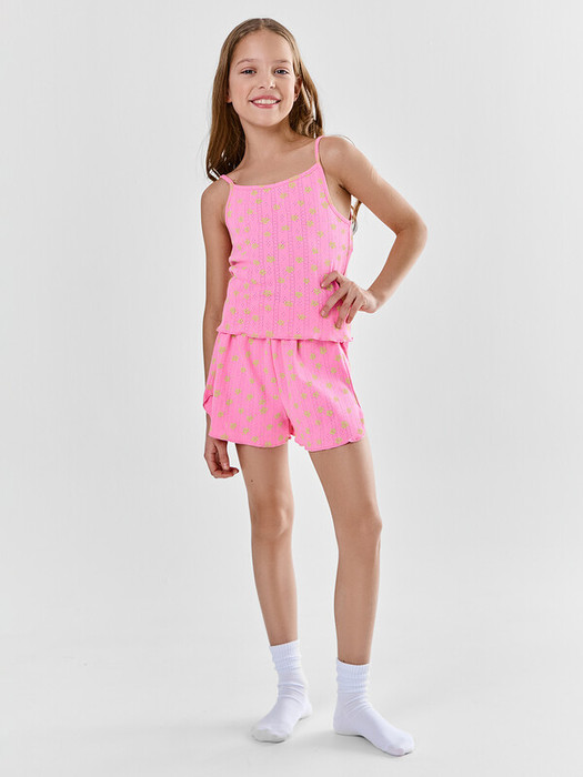 Низ топа обработан на микрооверлоке.  Шорты свободного силуэта выполнены из рибаны. Пояс цельнокроеный с эластичной тесьмой внутри (внутрення резина 30RV), ширина 30 мм. Низ шортов обработан на микрооверлоке.