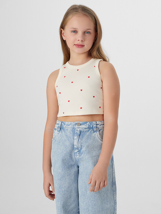 Топ для девочек прилегающего силуэта. Горловина круглая. Проймы и горловина окантованы бейкой из основного полотна. Низ изделия обработан швом в подгибку.